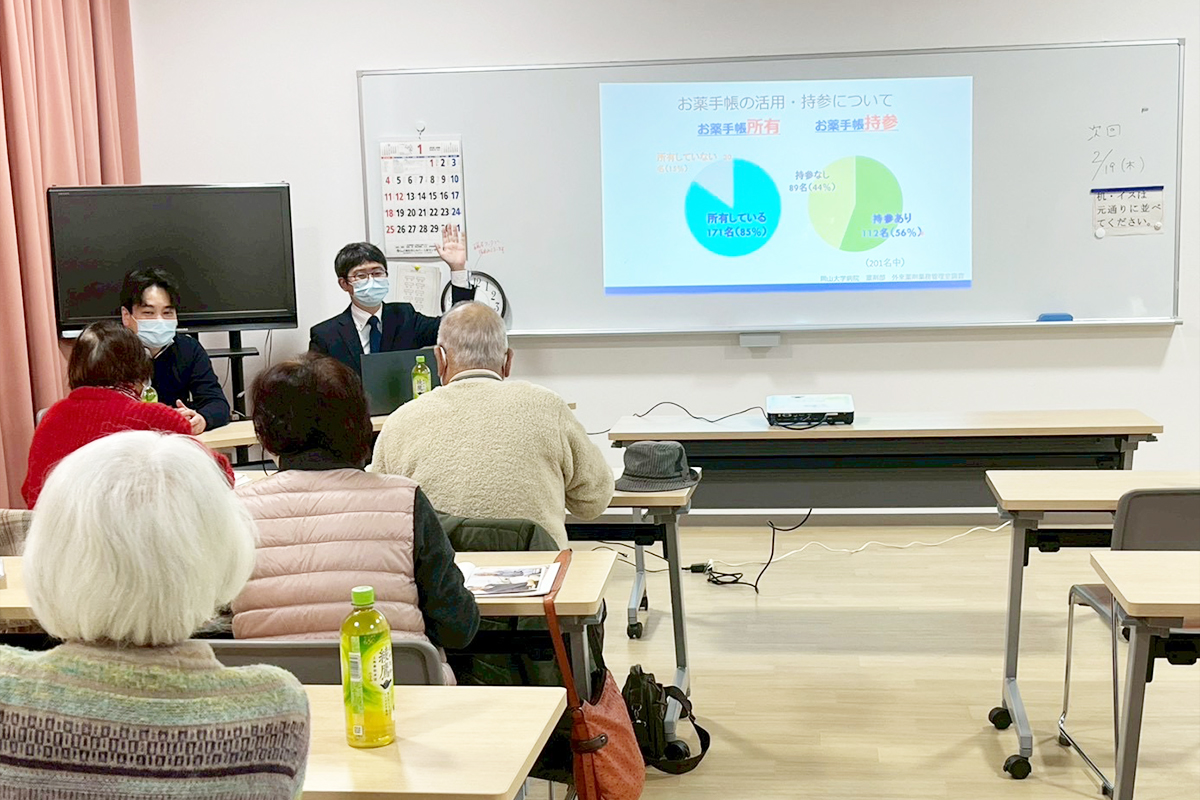 今回の健康教室は,岡山大学病院薬剤部出身で寄付講座「地域創生在宅薬学講座」の三浦太郎助教とのご縁を機に実現しました.また,生活習慣病や健康食品の分野で活動されている株式会社サイディンの弘津辰徳先生にもご協力いただき,大学・病院・企業が連携して地域の健康づくりに取り組む企画として開催しました.
