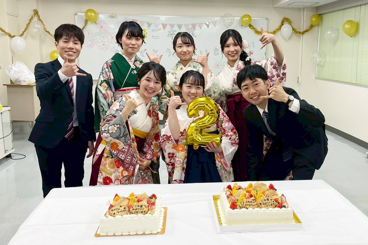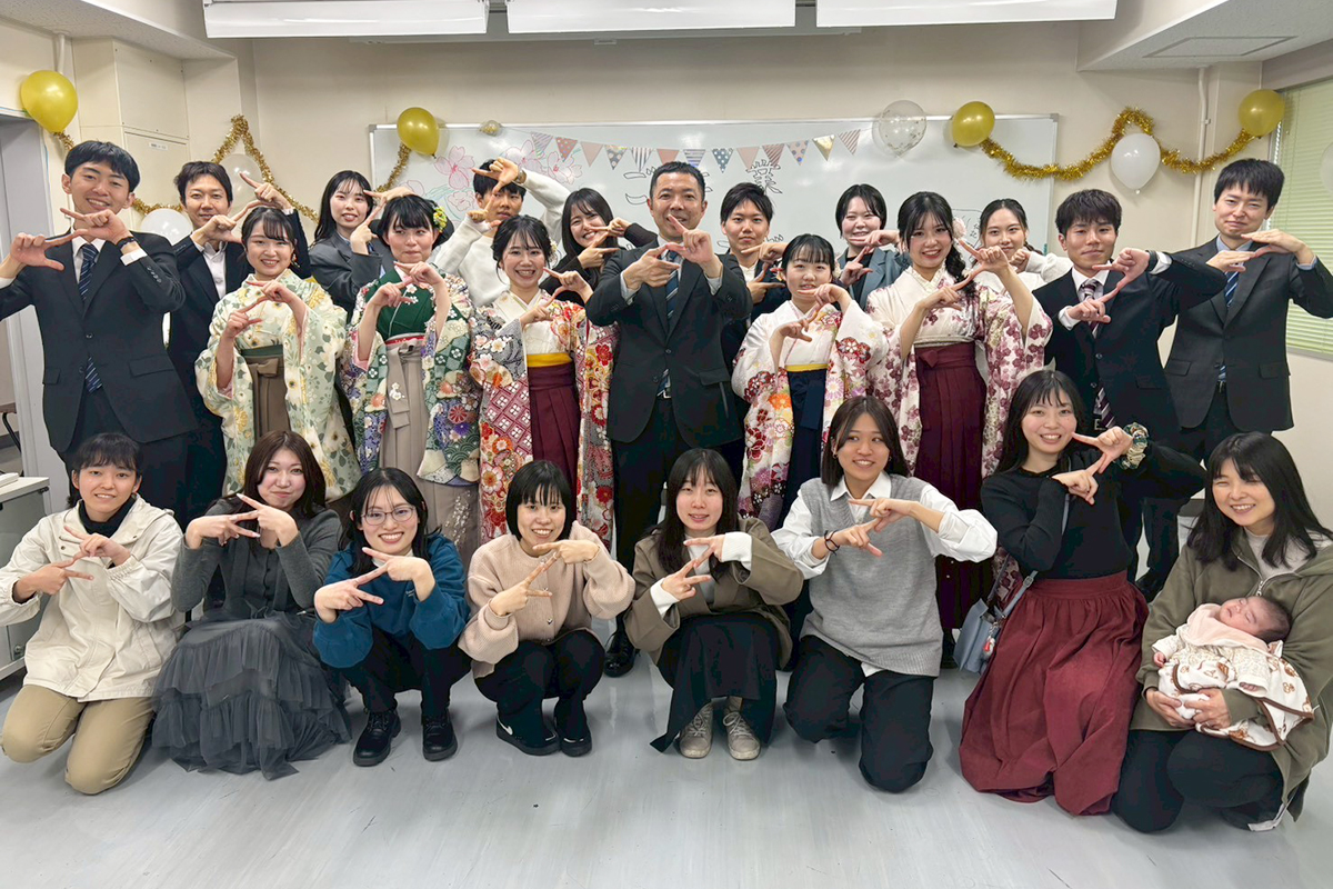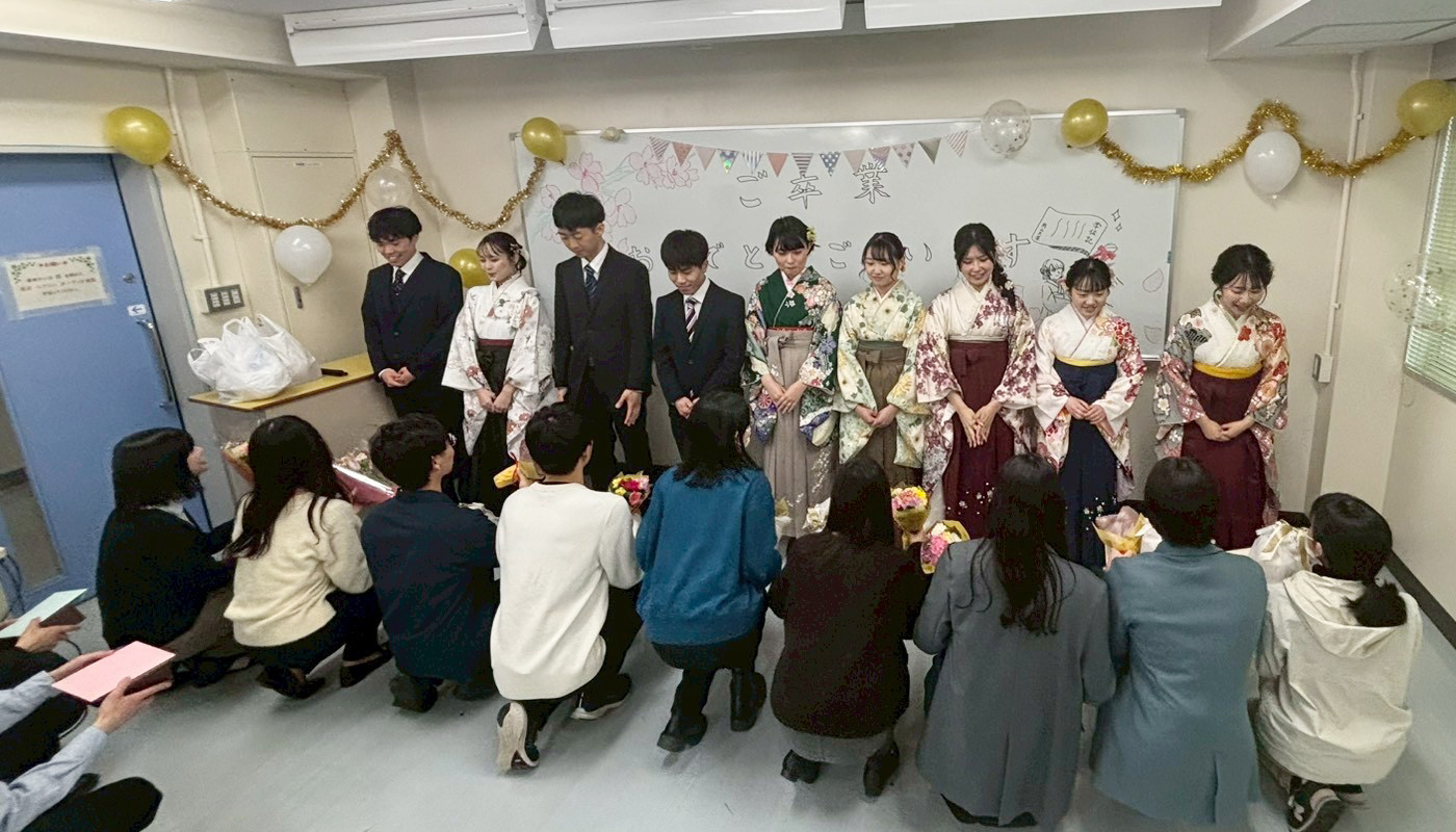 教員や在学生が集まり、第一期生の門出を温かくお祝いしました。