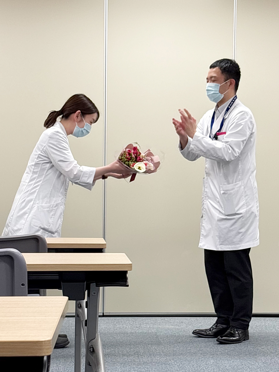 廣江訓子薬剤師(左)へ座間味義人薬剤部長(右)から花束を贈呈する様子