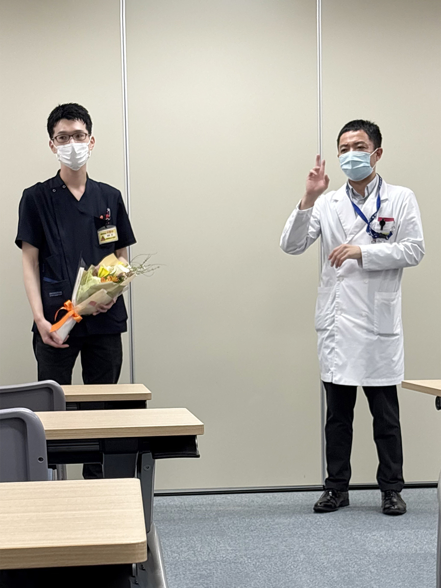 菊岡亮薬剤師(左)へ座間味義人薬剤部長(右)から激励の言葉を送る様子