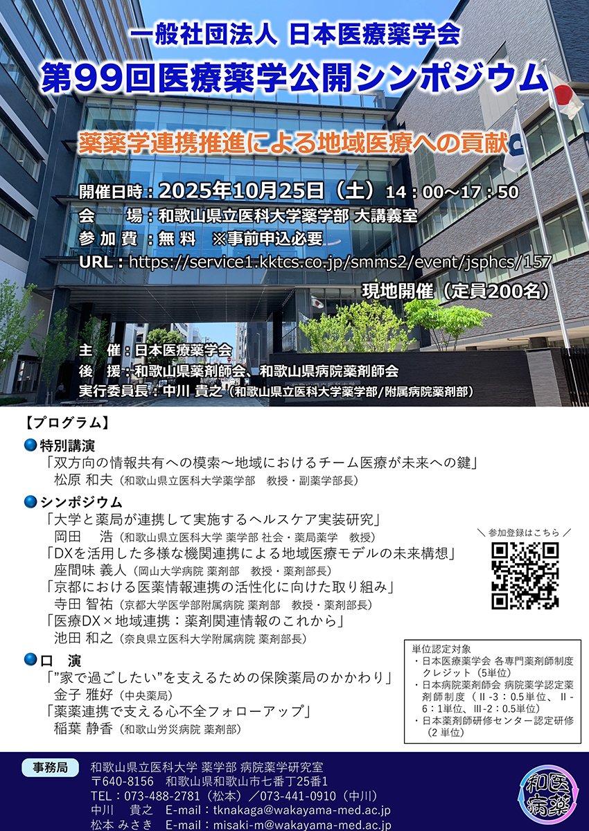 2025年10月25日(土)、和歌山県立医科大学薬学部にて開催された一般社団法人 日本医療薬学会 第99回医療薬学公開シンポジウム「薬薬学連携推進による地域医療への貢献」において、薬剤部長 座間味義人 教授がシンポジストとして講演を行いました。