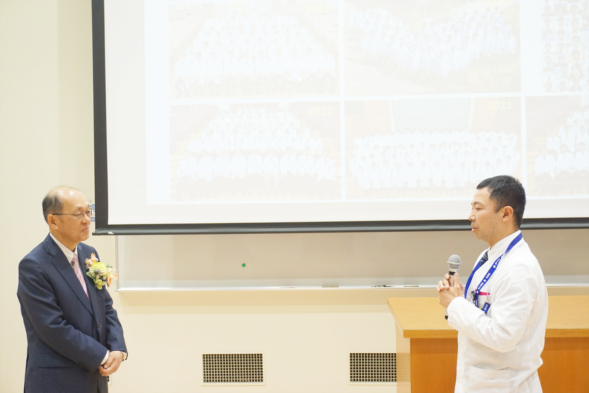 藤原教授は2010年に教授に就任されて以来,長年にわたり臨床・研究・教育の第一線で尽力されてきました.講義では,がん細胞のみを攻撃するウイルス製剤「テロメライシン」の開発や,2012年の「低侵襲治療センター」開設による腹腔鏡・ロボット手術の普及など,国内外で高く評価されている功績が紹介されました.特に,昨年12月に薬事承認申請に至ったテロメライシンの研究については,「仲間の支えにより,地方大学から世界に通用する研究を発信できた」と述べられました.藤原教授が示された「技と知のバトン」を次代へとつないでいく決意を新たにする,大変意義深い最終講義となりました.